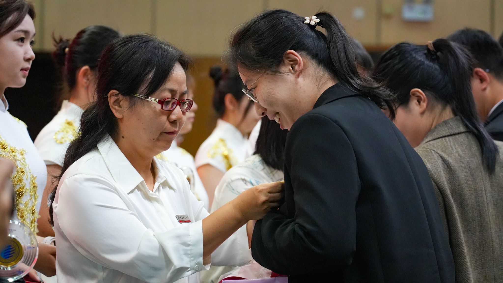 新进教师代表为从教满三十年教师代表送上鲜花祝福,从教满三十年教师代表为新进教师代表佩戴校徽。