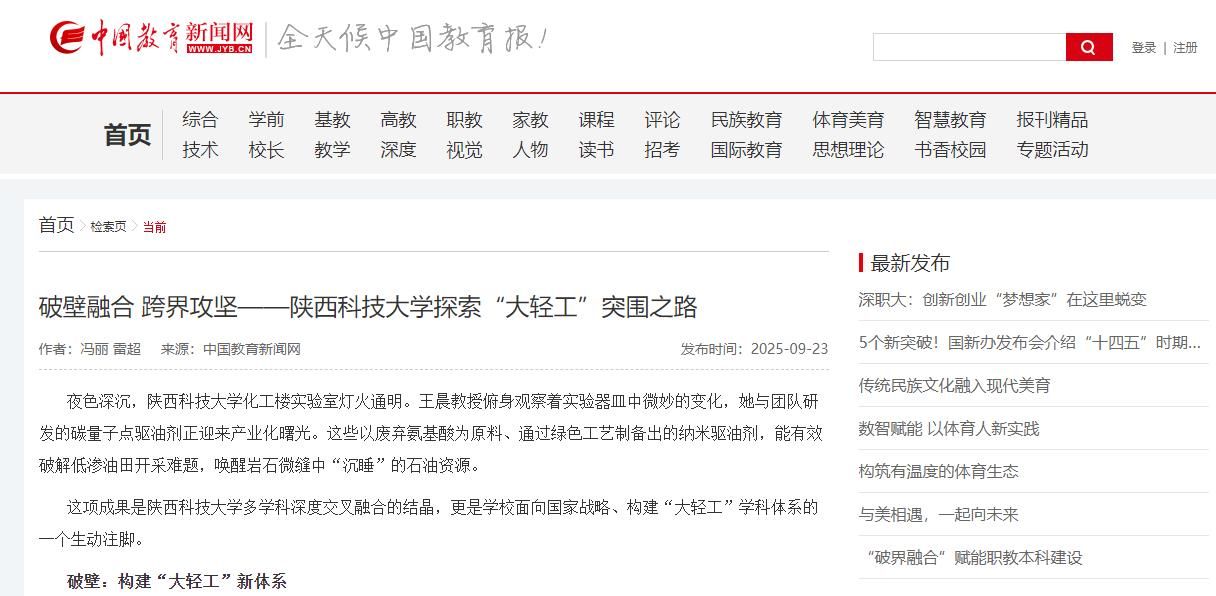 9月23日,中国教育新闻网报道陕西科技大学探索“大轻工”突围之路:破壁融合 跨界攻坚。