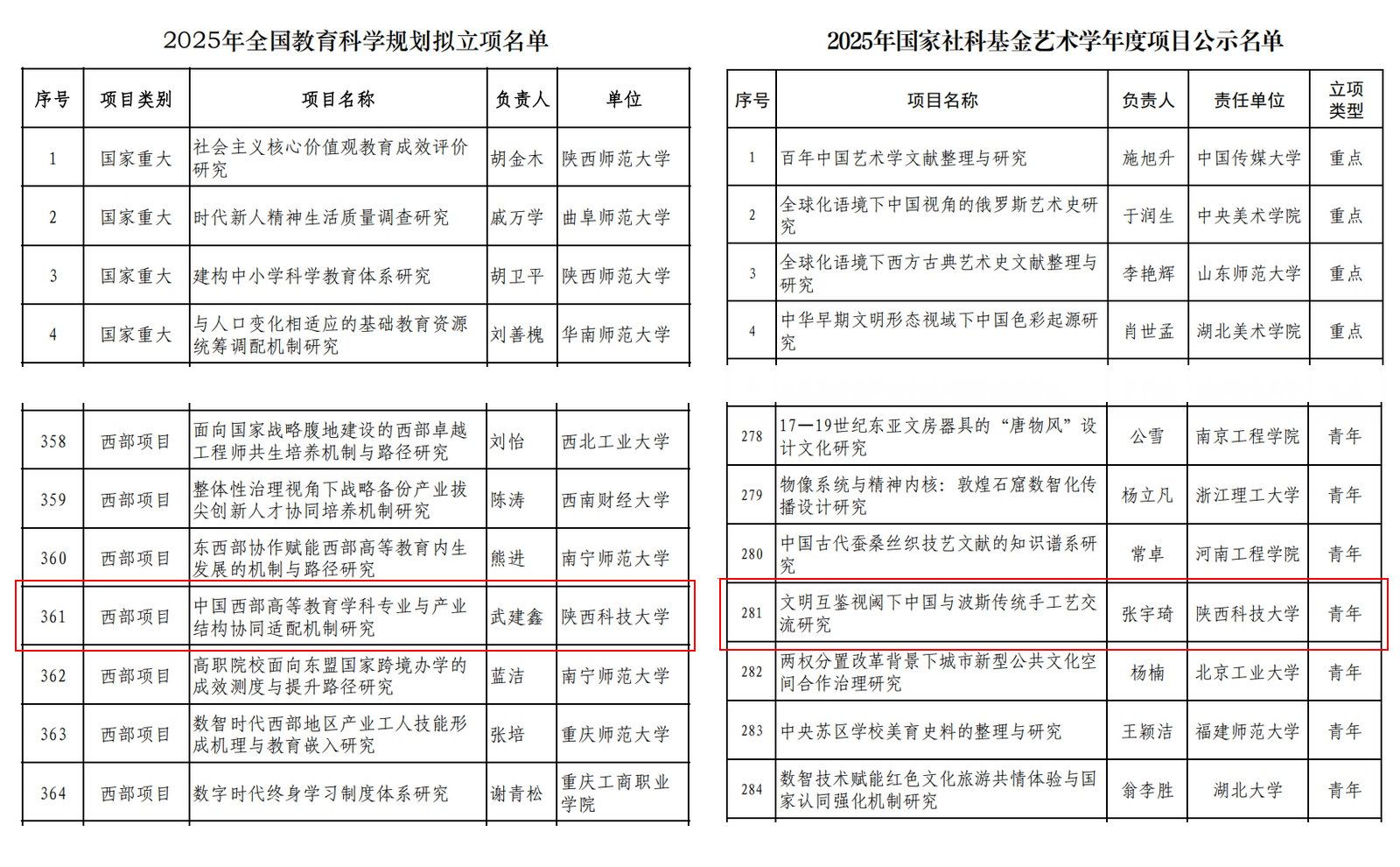 人文社科领域多点突破,高层次项目取得新进展。在人文社科领域,学校重点推进国家级、省级项目申报与成果培育。其中,张宇琦博士的《文明互鉴视阈下中国与波斯传统手工艺交流研究》获批国家社科基金艺术学年度项目公示;武建鑫教授在2025年国家社科基金(教育学)评审中成功立项,成为陕西省属高校仅有的3项立项之一。此外,学校组织24项成果申报陕西省第十七次哲学社会科学优秀成果奖,推荐6位专家参选习近平文化思想研究中心陕西协同研究基地专家库,并完成15项陕西省文化和旅游课题申报,人文社科影响力持续提升。