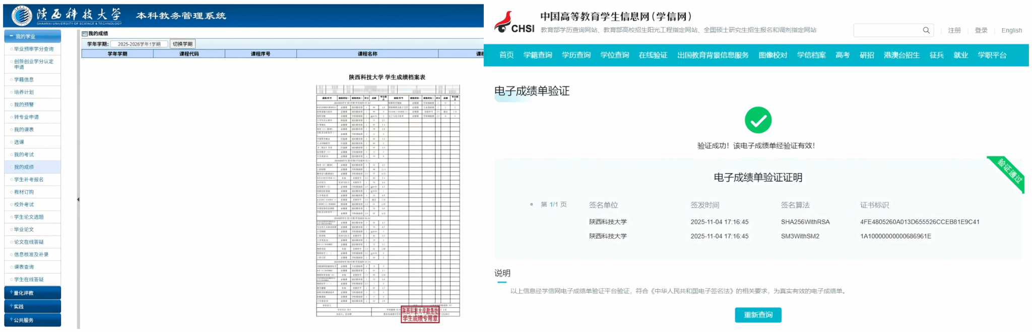 推行电子签章,优化师生服务体验。为进一步优化师生办事流程,教务处经过多方调研分析论证,于本学期上线本科生中英文电子签章业务,实现成绩单等材料的线上申请、自动审批与电子交付。学生提交申请后,系统自动加盖电子签章并生成验证码,形成“电脑受理、电子流转、自动出证”的审批服务闭环。该项服务支持学信网真实性核验,有效推动业务办理“无纸化、网络化”,真正实现“数据多跑路、师生少跑腿”,全面提升服务效率与用户体验。