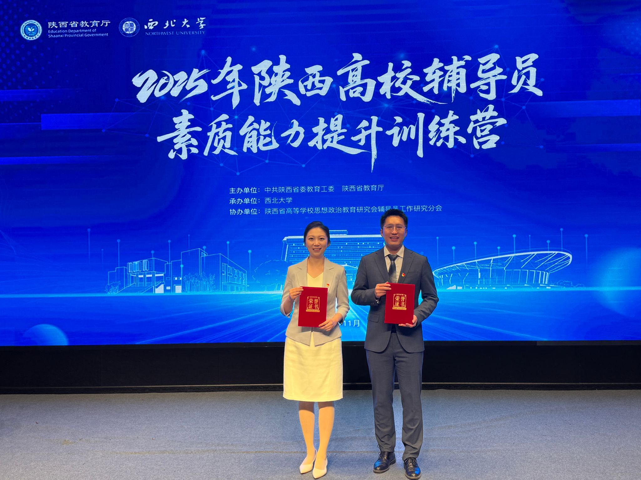11月5日至7日,由省委教育工委、省教育厅主办的2025年陕西高校辅导员素质能力提升训练营在西北大学长安校区举办。我校经济与管理学院辅导员陈强强、化学与化工学院辅导员孙钰涵,代表我校参加训练营并双双荣获“特别表现”奖。
