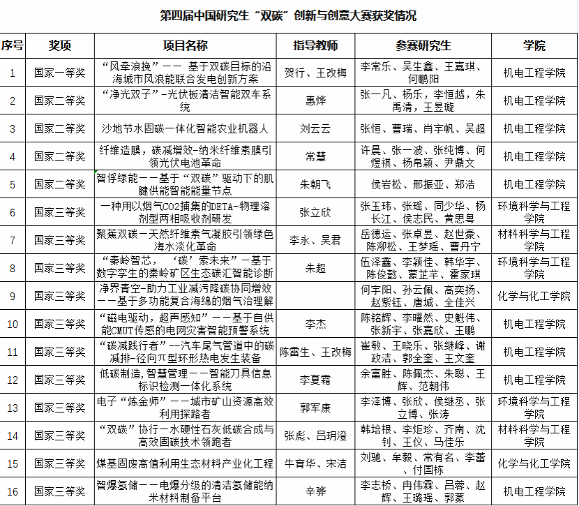 第四届中国研究生“双碳”创新与创意大赛决赛于11月7日至9日在沈阳化工大学落幕。赛事由教育部学位管理与研究生教育司指导,中国学位与研究生教育学会、中国科协青少年科技中心联合主办。我校研究生团队斩获16项国家级奖项,其中一等奖1项、二等奖4项、三等奖11项。此次参赛,我校不仅实现该项赛事国家一等奖的历史性突破,更以总分第十的佳绩获评全国高校优秀组织单位奖。