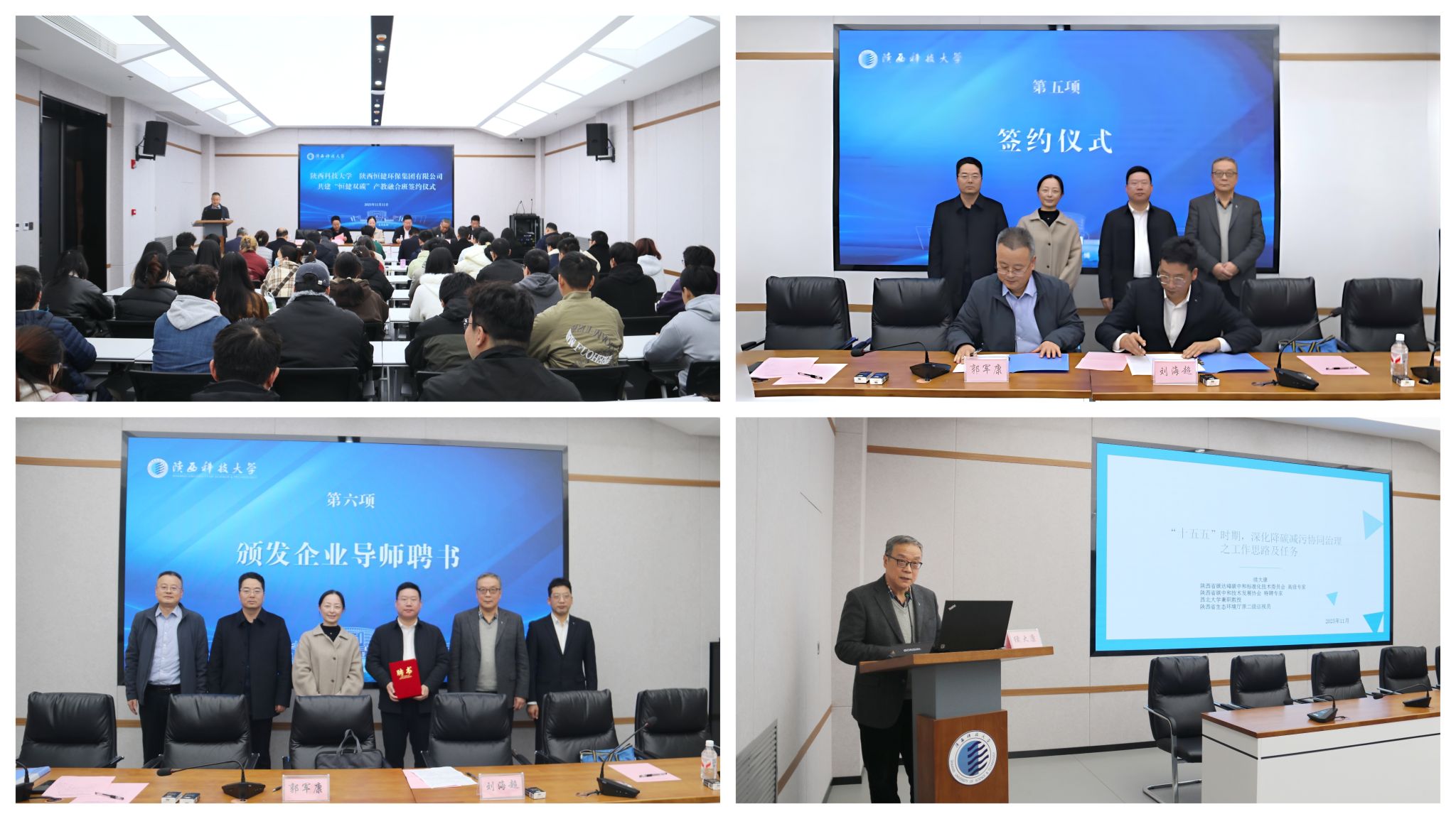 11月11日,环境科学与工程学院(碳中和科学与技术学院)与陕西恒健环保集团有限公司共建“恒健双碳”产教融合班签约仪式在至诚至博会议中心举行。校党委副书记、纪委书记、监察专员罗莹出席会议并致辞,恒健环保集团公司董事长王韶、省生态环境厅原二级巡视员续大康出席会议,教务处负责人、恒健环保集团企业代表、环境学院班子成员及师生代表参加仪式。仪式由环境学院院长郭军康主持。