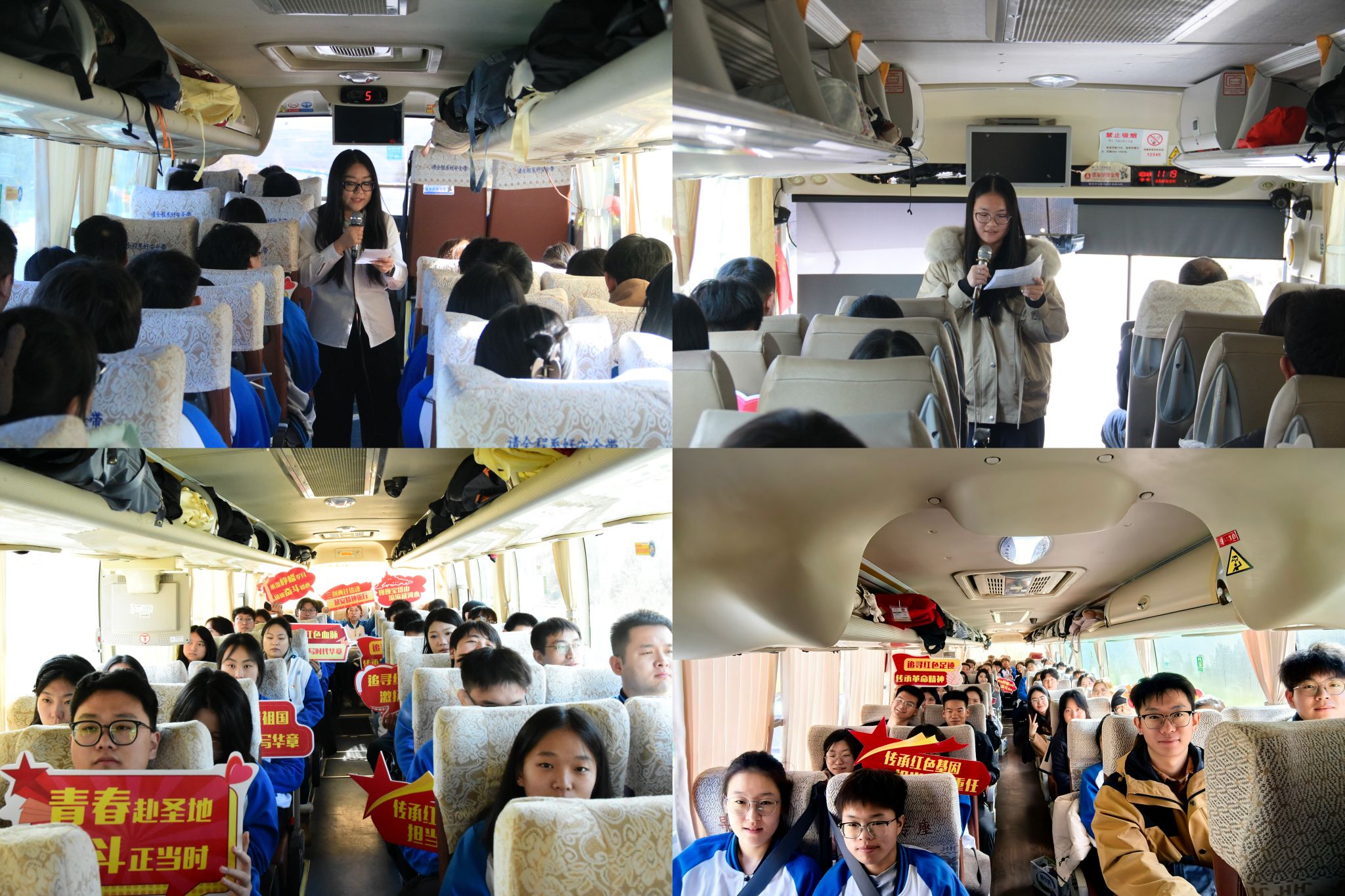 清晨朝阳初升,研学队伍整装出发,大巴车化身移动思政课堂。马克思主义学院师生宣讲团以“传承红色基因 勇担青春使命”为主题开展宣讲,宣讲既深入解读延安精神的时代内涵,又结合学校与际华三五一三实业有限公司18年的校企合作实践,将报国为民的红色基因转化为鲜活的育人案例,课程尾声,《没有共产党就没有新中国》等红色歌曲响彻车厢。