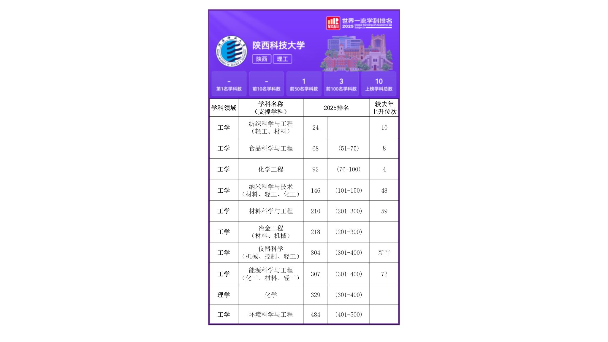 11月18日,高等教育评价专业机构软科正式发布2025“软科世界一流学科排名”。陕西科技大学10个学科上榜,其中纺织科学与工程为世界排名前50名学科,食品科学与工程、化学工程均为世界排名前100名学科,仪器科学为今年新晋上榜学科。
