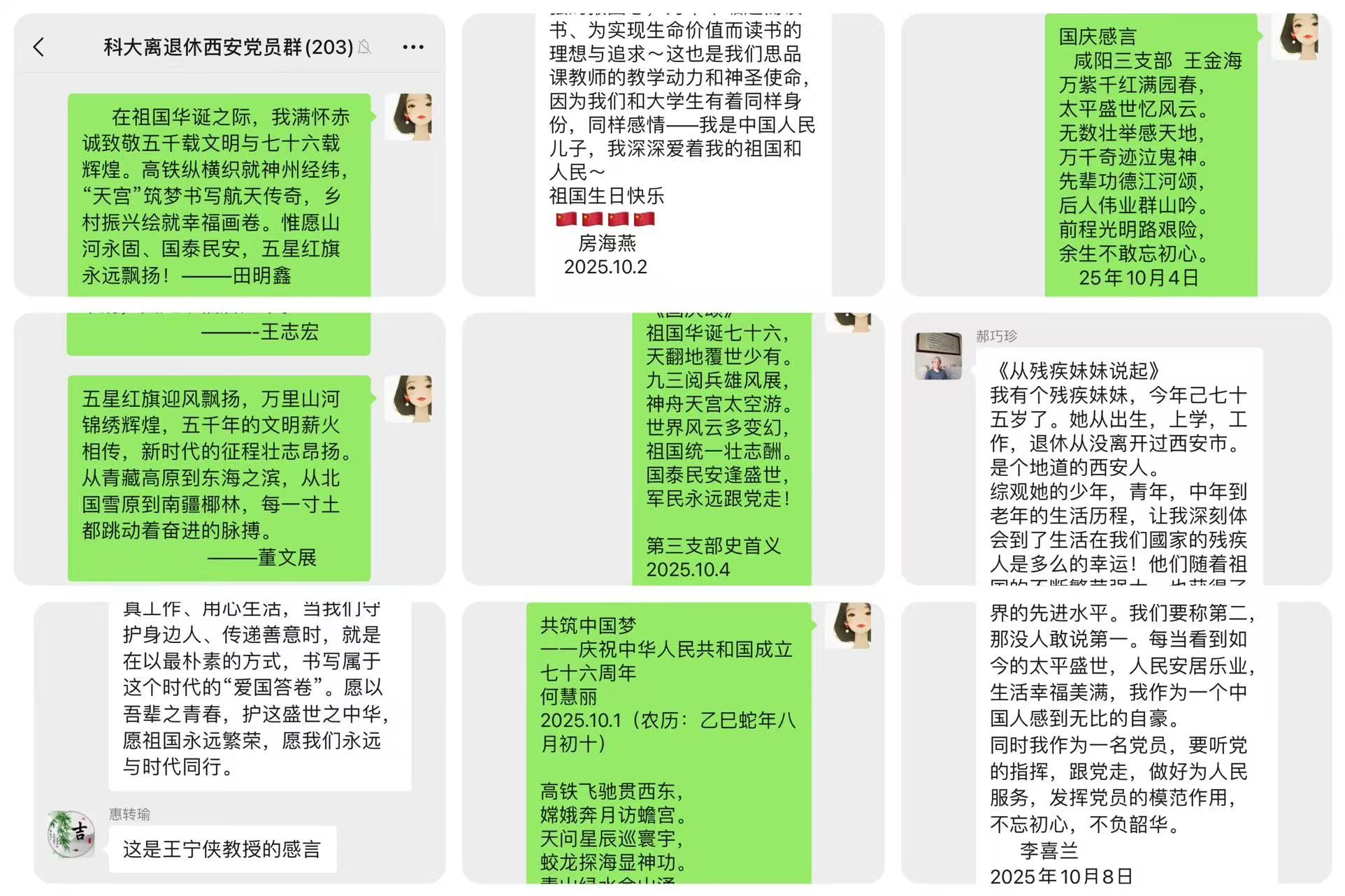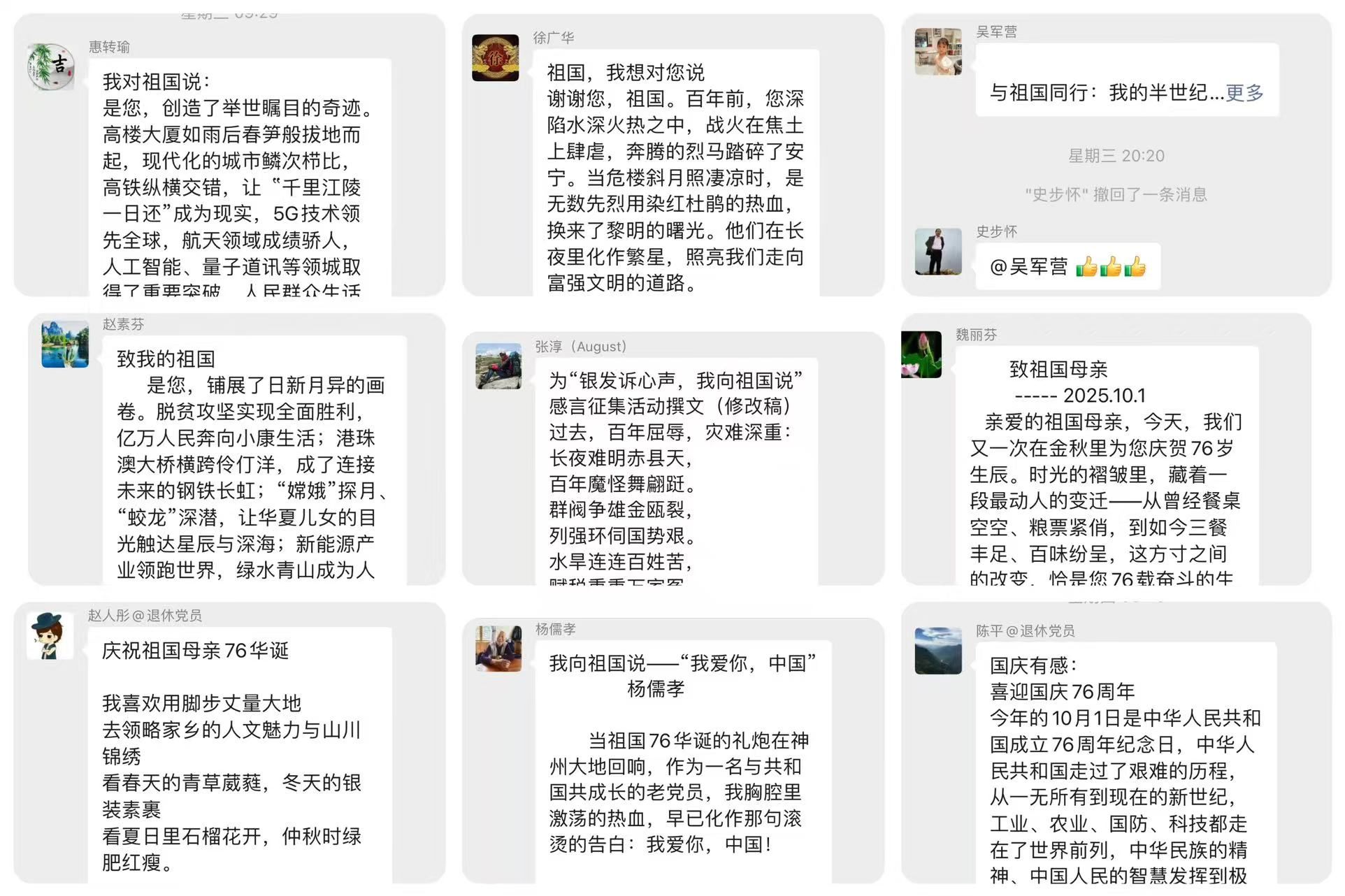 为庆祝中华人民共和国成立76周年,抒发对祖国的深切热爱,凝聚银发力量,近日,离退处党委精心组织开展“时光映照初心,银龄告白祖国”退休党员庆国庆感言征集活动,五十余位退休老党员积极响应,以真挚文字诉说家国情怀,用岁月故事诠释初心使命。