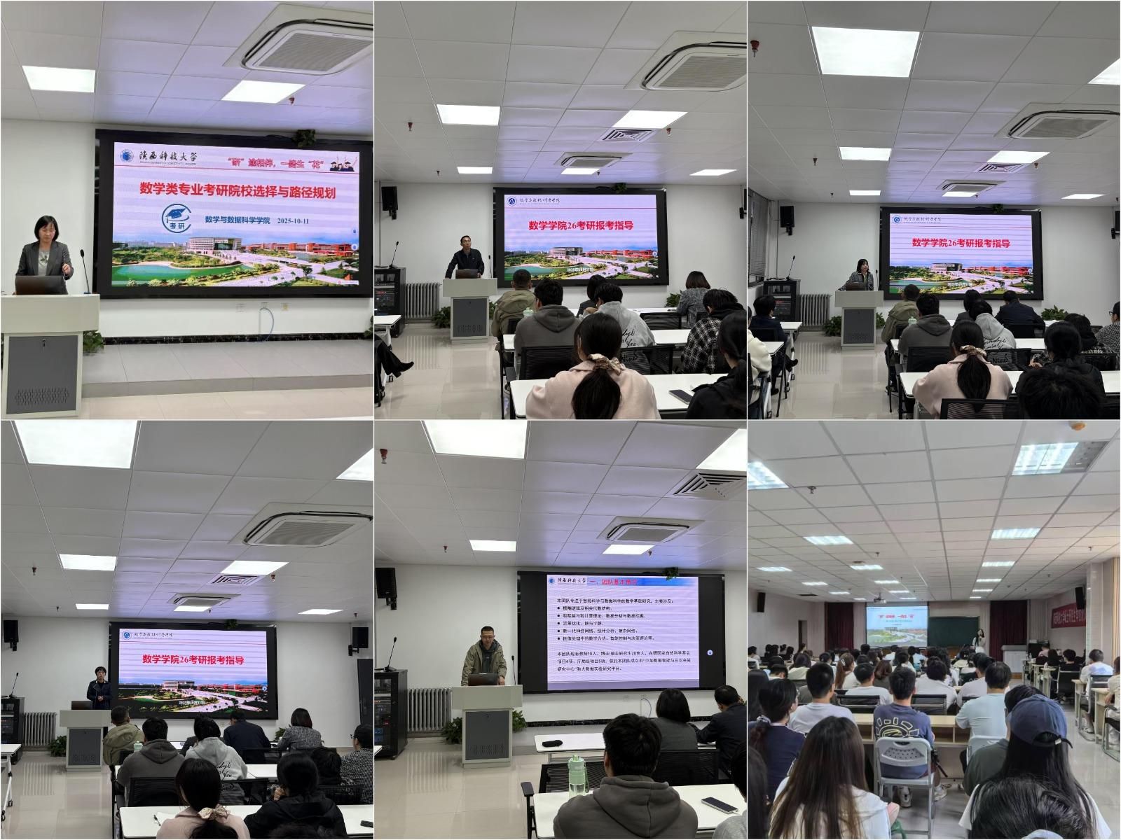 前置指导服务,构建全程体系。学院高度重视人才培养工作,将考研指导服务作为“一把手工程”强力推进。今年6月,依托学院第四届求职训练营,先后开展了两场主题鲜明、内容丰富的考研指导活动。6月12日,举办“数学类专业考研方向选择与路径规划”专题讲座,郭改慧围绕精准定位、科学规划、高效备考等关键议题,系统剖析数学学科考研形势,引导学生树立梯度化报考目标、合理规划复习进度。6月15日,学院邀请华中科技大学、陕西师范大学、西安电子科技大学、西北大学、山西大学等十余所省内外高校数学学科负责人来校交流,各高校代表详细介绍了本校数学学科特色、招生政策、备考建议等,并在交流环节为学生答疑解惑,帮助学生明确报考目标、明晰备考方向。