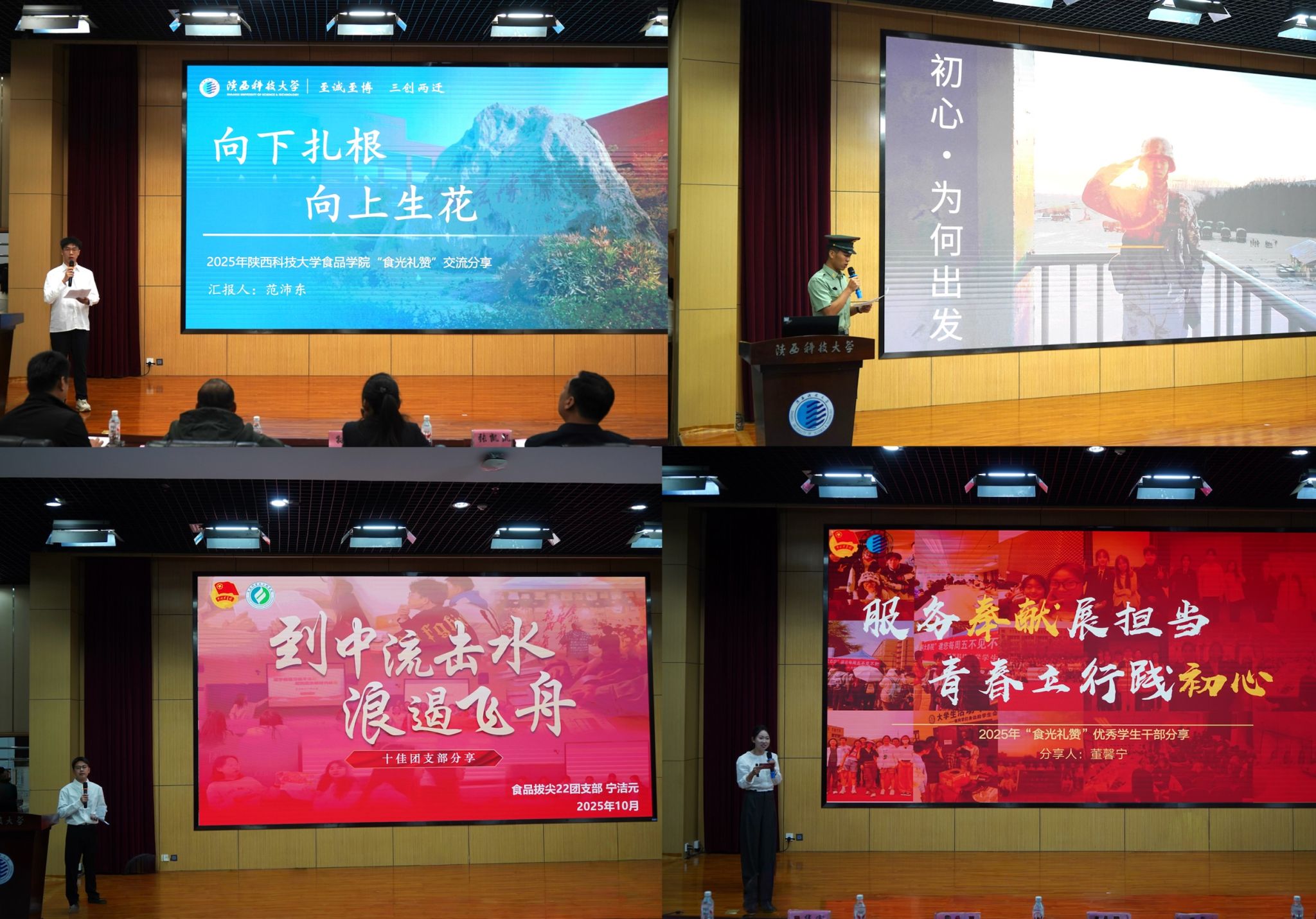 活动以“食光启航 砥砺前行”为主题,设立“食光”模范奖、“食光”拼搏奖、“食光”卫国奖、“食光”凝聚奖、“食光”卓越奖、“食光”桃李奖等十余个类别的奖项,集中表彰上一年度表现优秀的典型个人和先进集体。优秀学生代表董馨宁、张思雯、三永隆、范沛东和优秀宿舍、十佳团支部等先进集体代表分别分享德智体美劳全面发展的青春故事及集体建设经验。