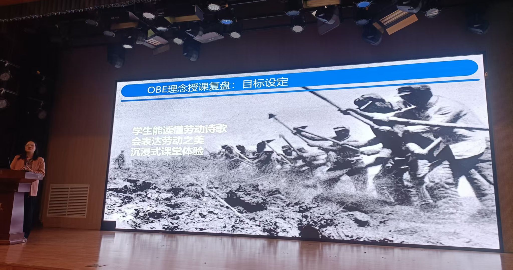 李静以“抗战时期的劳动主题诗歌教学及其反思”为切入点,从目标设定、任务清单、OBE理念落地、授课复盘,详细的分析了教师如何运用理论联系情景,运用启发教学法、问题教学法、项目教学法、案例教学法等等,来塑造和提升学生的能力表达,使学生能够沉浸式体验课程的魅力。