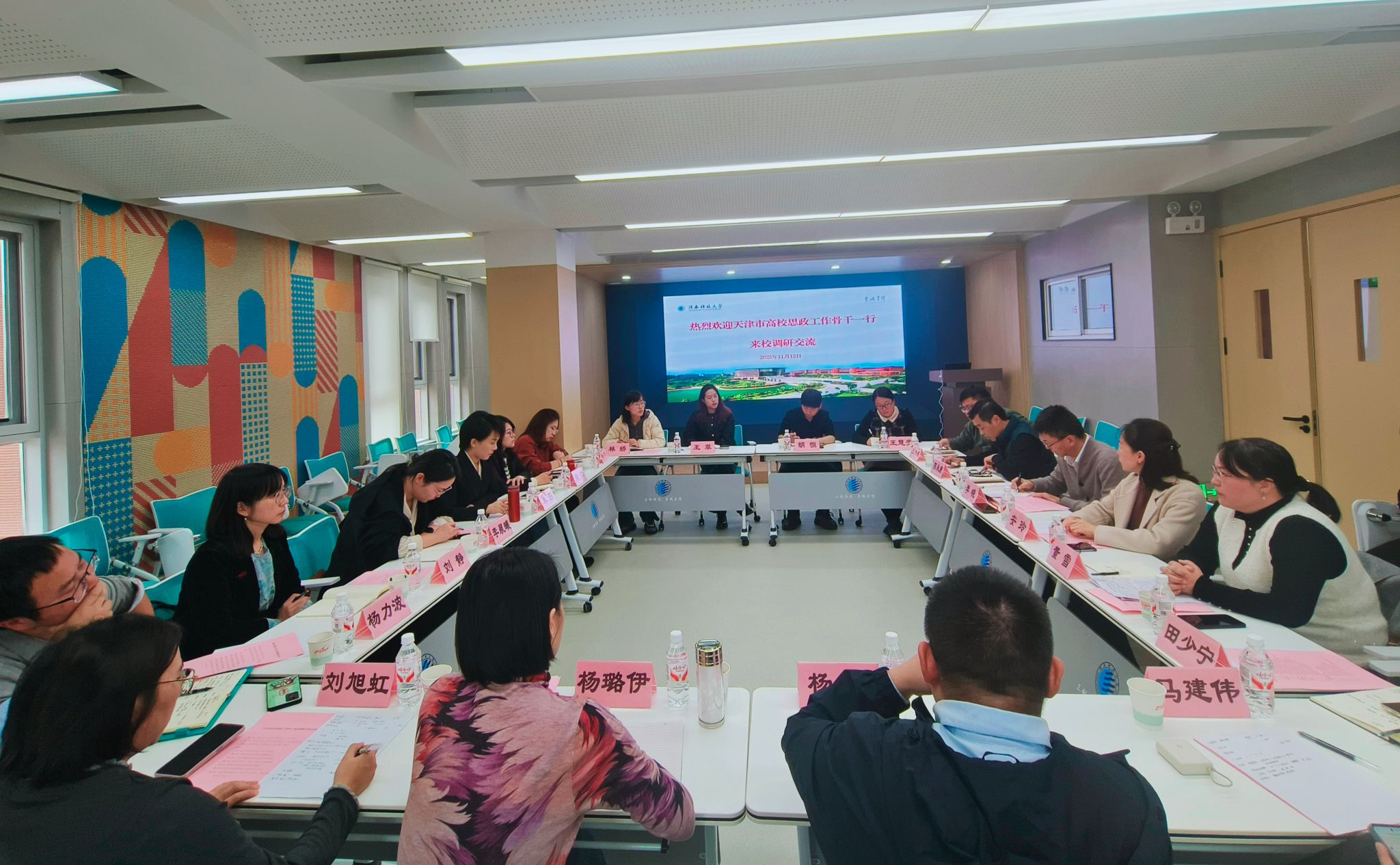 李晓对天津市高校思政工作骨干一行表示热烈欢迎,介绍了学校相关情况,并围绕“三个贯通”思路,分享了相关工作实践及在“无痕化管理”等方面的创新举措。学工部、网络思想政治工作中心相关负责人分别介绍了辅导员队伍专业化发展支撑体系、“一站式”学生社区建设和AI思政平台及红色文化课程开发等情况。双方还围绕共同关心和面临的问题进行了深入研讨交流。
