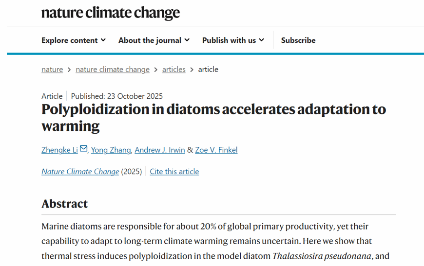 近日,我校食品科学与工程学院(生物与医药学院)李政科副教授与福建师范大学的张勇副教授、加拿大达尔豪斯大学的Zoe V. Finkel教授和Andrew J. Irwin教授合作,在国际顶级期刊《自然·气候变化》(Nature Climate Change)发表了题为“硅藻多倍体化加速其对气候变暖的适应”的研究论文。我校李政科副教授为第一作者和通讯作者,陕西科技大学为第一单位。该研究成果得到了国家自然科学基金面上项目和青年基金(32371681,32001180)、加拿大自然科学暨工程研究委员会基金、加拿大研究主席项目、美国CBIOMES等项目的资助。该研究证实,热胁迫具有诱导海洋硅藻假微型海链藻(Thalassiosira pseudonana)发生多倍体化(即基因组加倍)的潜力,且多倍体藻株在高温环境下表现出比二倍体祖先更快的适应速度。