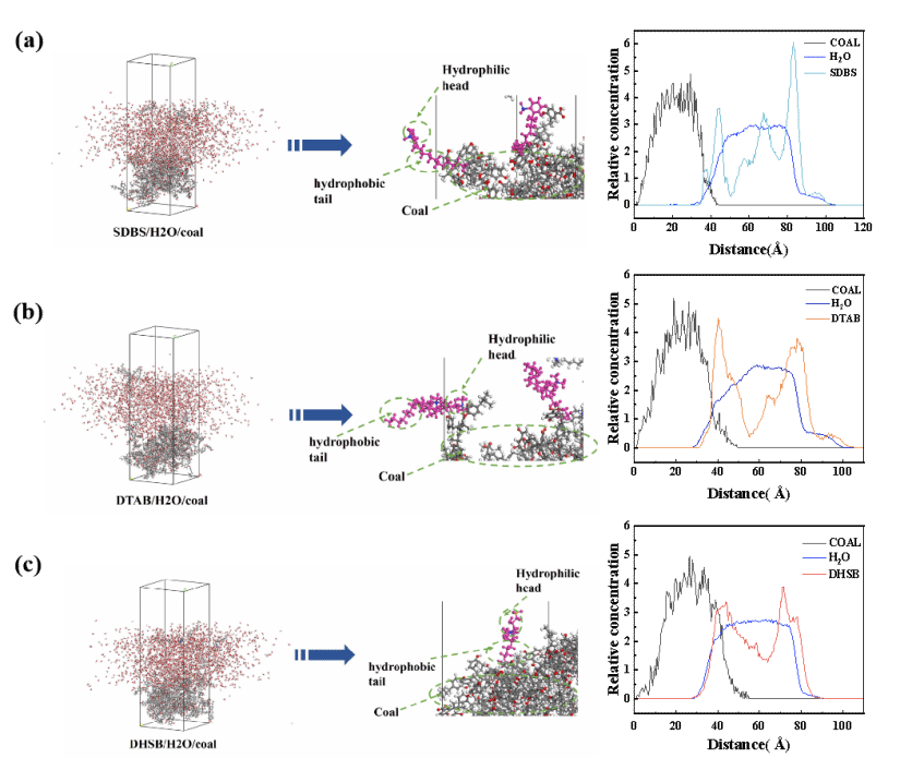 如图1(a)SDBS(阴离子):疏水尾链向煤表面聚集,亲水头部向水相延伸,与煤表面密度曲线部分重叠,表明吸附作用显著;(b)DTAB(阳离子):头部正电荷与煤表面负电荷位点结合,密度峰值靠近煤表面,尾部伸入水相,形成疏水层;(c)DHSB(两性):阴、阳离子基团协同吸附,密度分布范围更广,体现广谱煤阶适配性。( 详见DOI: 10.1016/j.colsurfa.2025.136276 )