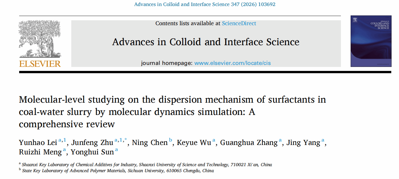 近日,我校化学与化工学院应用化学与技术团队张光华教授、朱军峰教授(通讯、共同第一作者)、硕士生雷云浩(第一作者),联合四川大学先进高分子材料全国重点实验室陈宁研究员,围绕水煤浆(CWS)清洁利用的核心技术难题,通过实验与分子动力学(MD)模拟相结合,揭示了表面活性剂在水煤浆中的微观分散机理,为高效、环保水煤浆分散剂的理性设计提供了全新理论框架。相关成果以 “Molecular-level studying on the dispersion mechanism of surfactants in coal-water slurry by molecular dynamics simulation: A comprehensive review” 为题,发表于胶体与界面科学领域国际顶级期刊《Advances in Colloid and Interface Science》(中科院一区Top, IF 19.262)(2026 年,Volume 347, 103692,DOI: 10.1016/j.cis.2025.103692)。该期刊是化学工程、材料科学领域学者获取前沿理论与技术的重要平台,其发表的综述类文章常被作为领域内研究的关键参考依据。