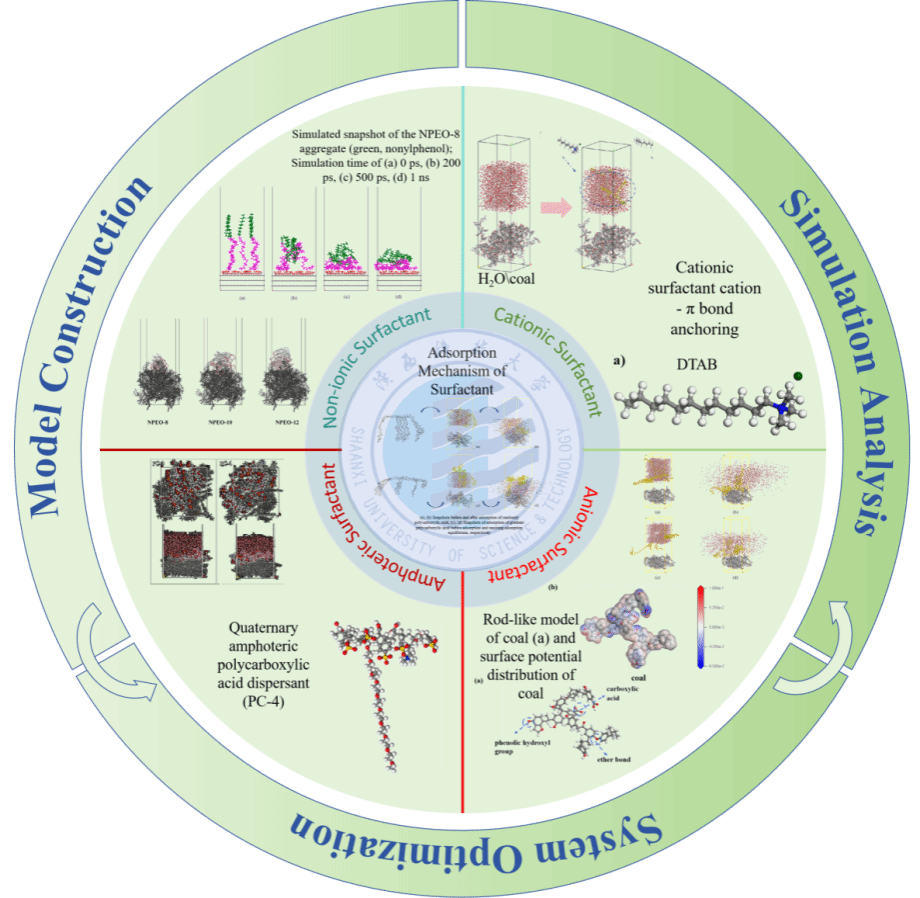 分子动力学模拟技术凭借在分子水平解析动态行为与热力学性质的独特优势,成为突破这一瓶颈的关键工具,该技术可在原子尺度分析表面活性剂在煤表面的吸附动力学,量化关键参数以深化作用机制研究,为低阶煤的高效清洁利用提供理论支撑。https://doi.org/10.1016/j.cis.2025.103692