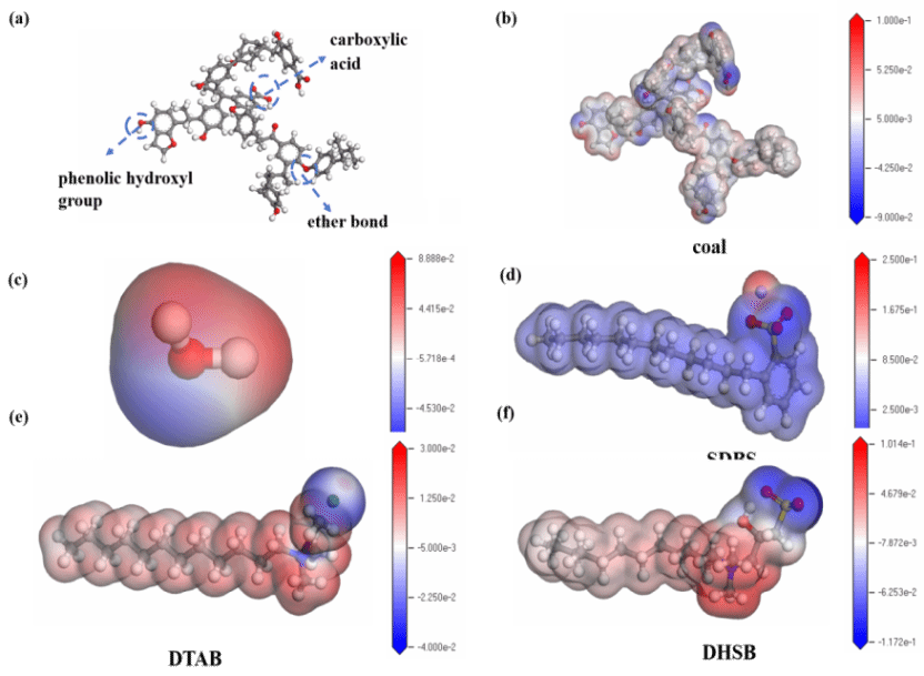 图2 (a)煤炭棒状模型,(b)煤炭表面电势分布,(c)水分子,(d)SDBS,(e)DTAB,(f)DHSB表面活性剂。