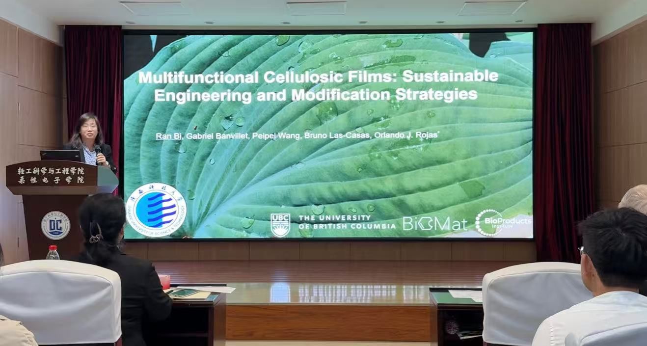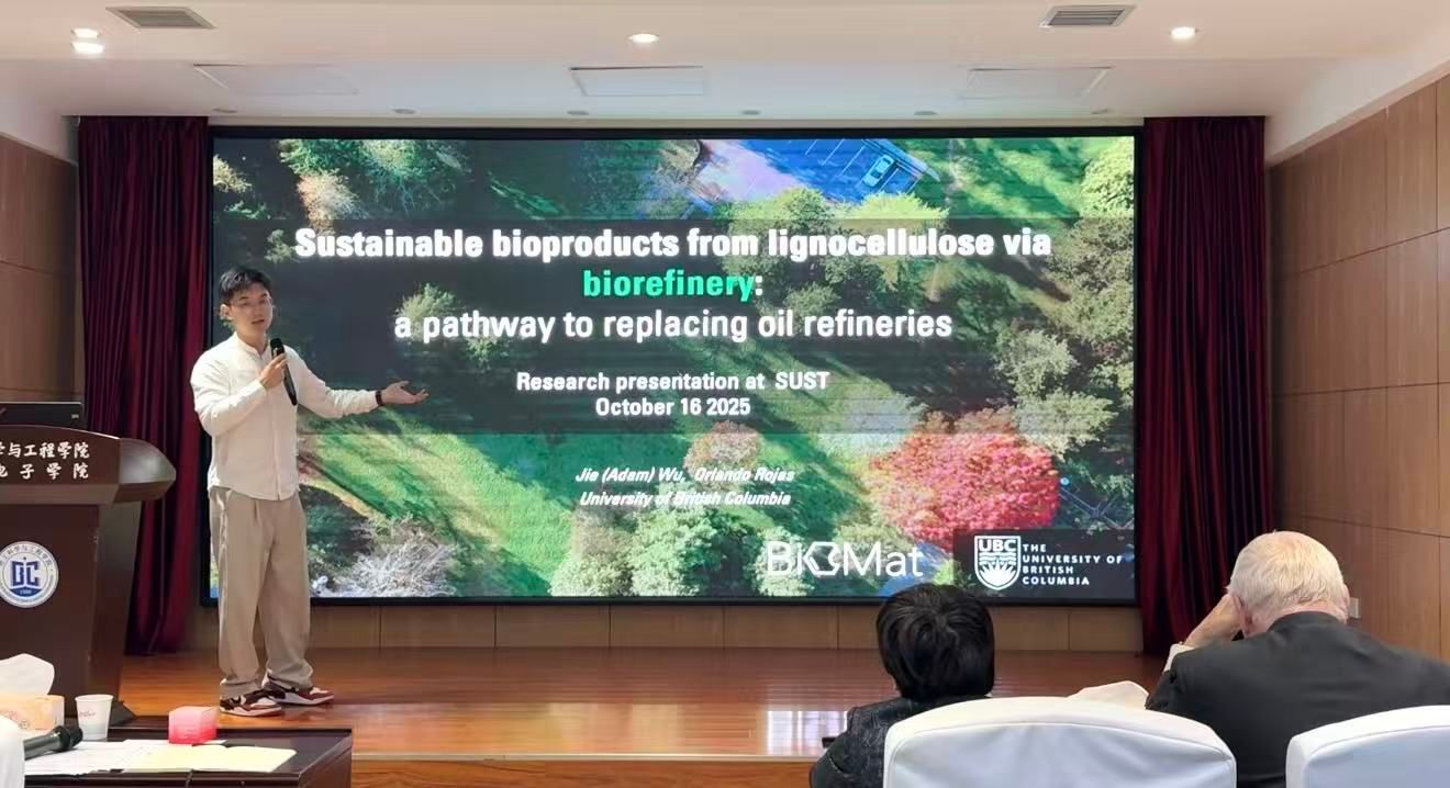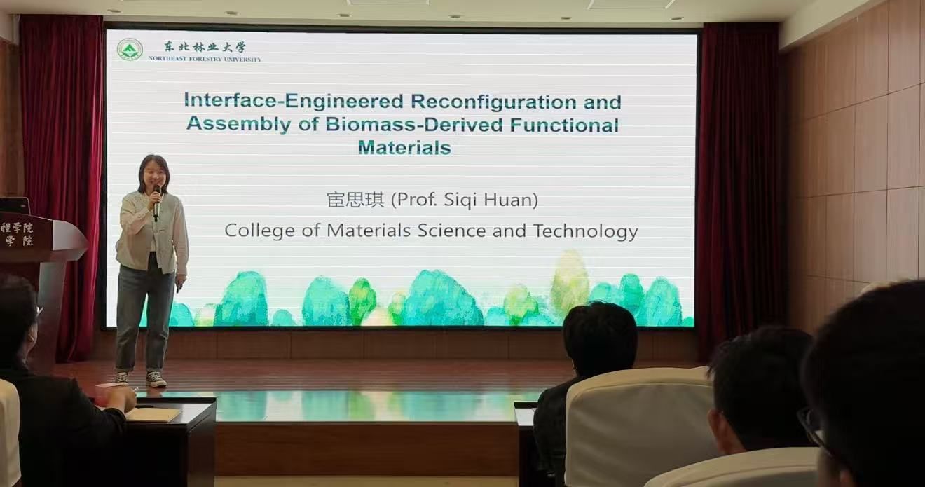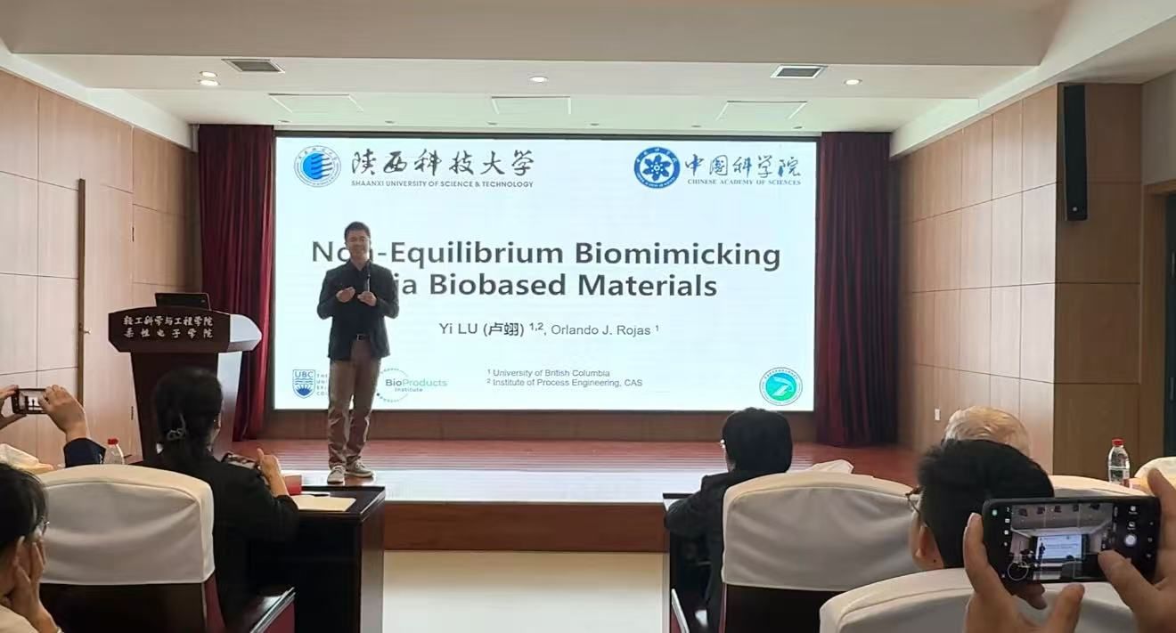 UBC毕然研究员介绍了具有定制功能的纤维素基薄膜创新制备策略,包括物理结构构建、化学改性和废弃物再利用。展示了木质纤维素在设计高性能、多功能材料方面的灵活性。UBC吴杰博士后介绍了通过生物炼制技术从木质纤维素中获取可持续生物产品的方法,并对生物精炼技术未来在提升转化效率、降低成本及推动产业化应用的发展展开了探讨。中国科学院过程研究所卢翊研究员围绕可再生资源高效转化与绿色制造的前沿方向,阐述了如何利用生物质组分胶体间非共价相互作用构筑和利用非平衡态液液界面等。为开发兼具高效转化率与高附加值的绿色新材料体系提供新理论方向与技术路径。东北林业大学宦思琪教授通过利用界面工程策略,从富含羟基和复杂网络结构的纤维素和木质素(生物聚合物)中通过液/液界面实现自组装,形成乳液胶体,设计并制备出了多维功能材料。克服了一维材料中协同结构-功能设计的长期难题。