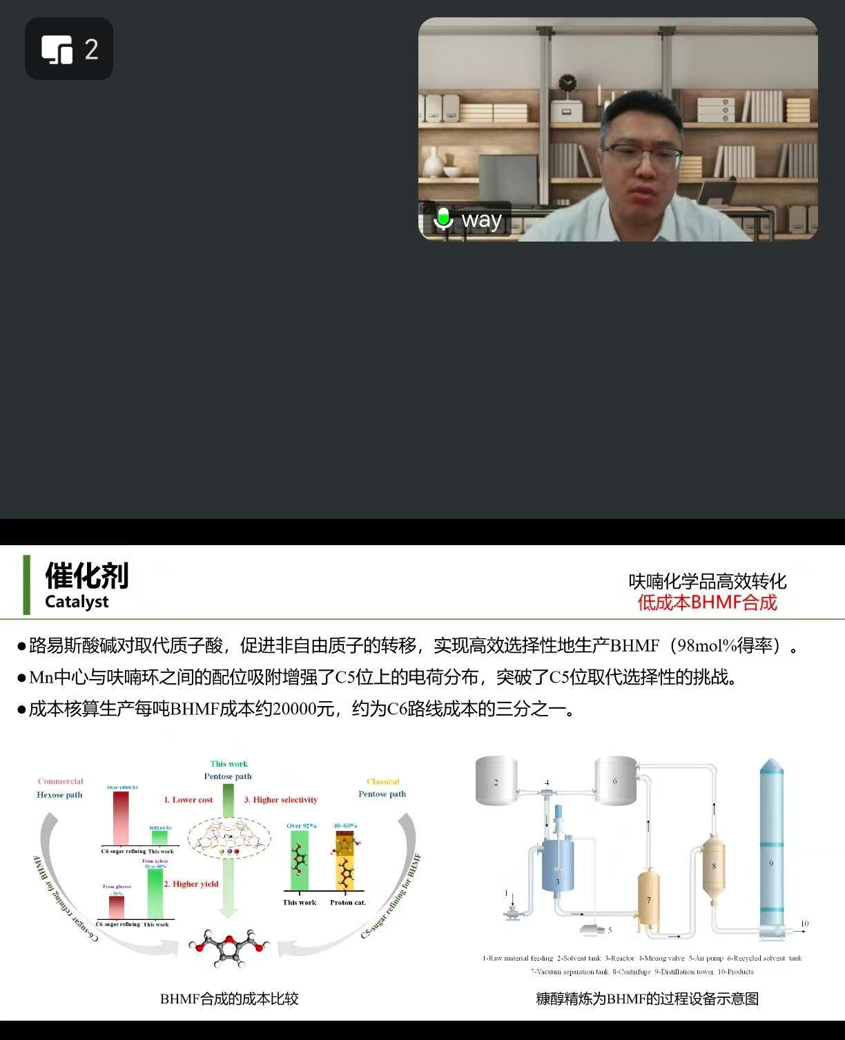 王奎研究员在生物基呋喃化学品低碳高效转化领域的研究报告中先介绍了生物基呋喃化学品低碳高效转化领域的相关技术背景,详细介绍了阴离子效应对葡萄糖转化为5-羟甲基糠醛(HMF)的调控机制,通过电子张力效应加速糖类定向转化,为均相催化剂筛选提供理论依据。进一步,王奎研究员详细介绍了其团队在创制液态粮食(单糖、低聚糖)、呋喃基聚酯(PEF)、聚酰胺等功能材料的高值化产品开发方面所开展的一些工作,推动了生物基材料在能源和化工领域的应用。最后,王奎研究员谈及了其课题组在产业化与示范方面所开展的一些工作。王奎研究员的学术报告展示了他在呋喃基材料在功能化应用方面的研究进展,对大家今后研究方向的拓展有很好的启发性。