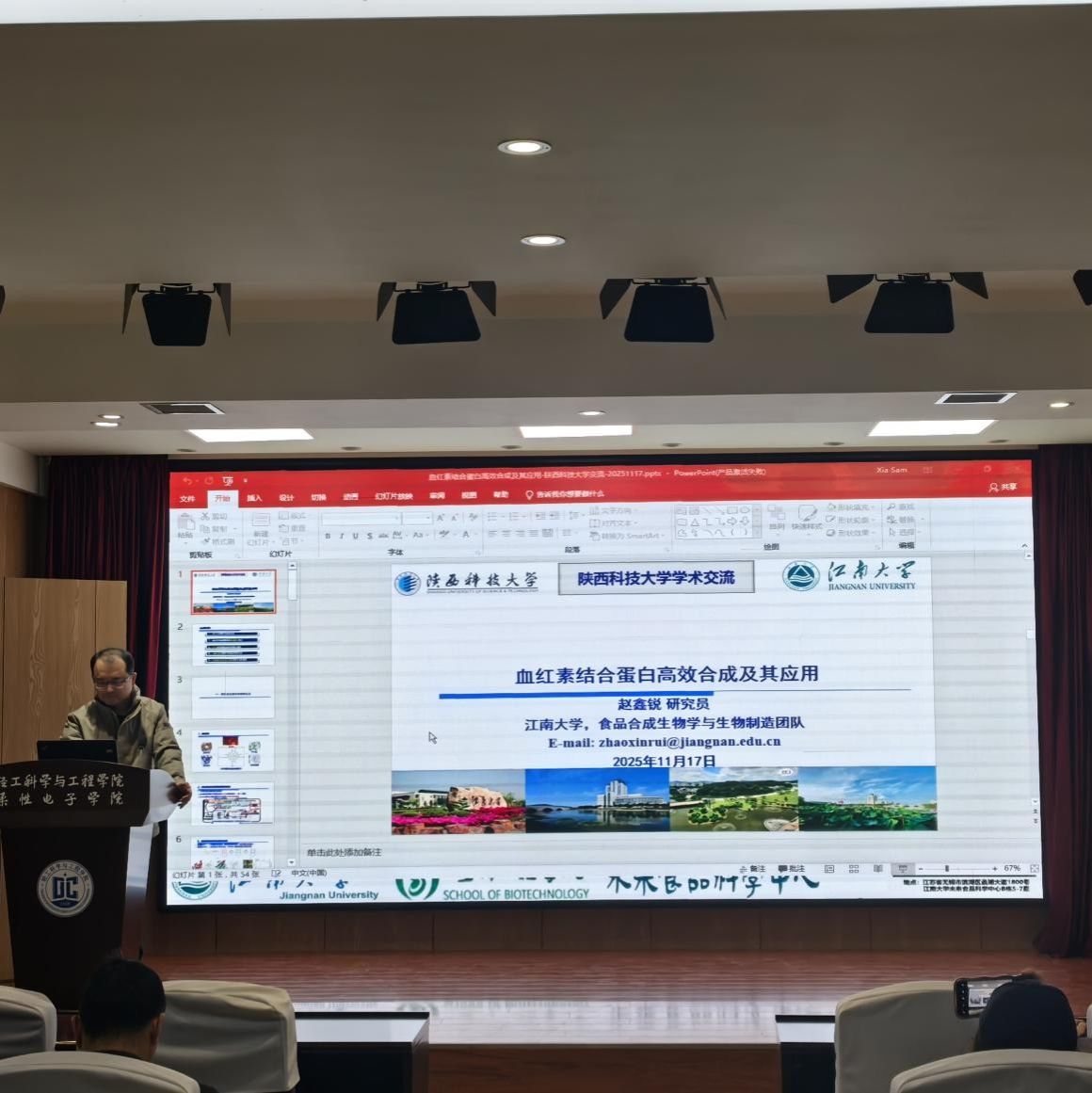 11月17日上午,受科技处、前沿院及轻工科学与工程学院(柔性电子学院)邀请,江南大学赵鑫锐研究员做客陕西科技大学“前沿科学报告”,作了题为“血红素结合蛋白高效合成及其应用”的学术报告。报告会由轻工学院院长吕斌主持,学院相关专业教师、研究生参加了此次报告会。