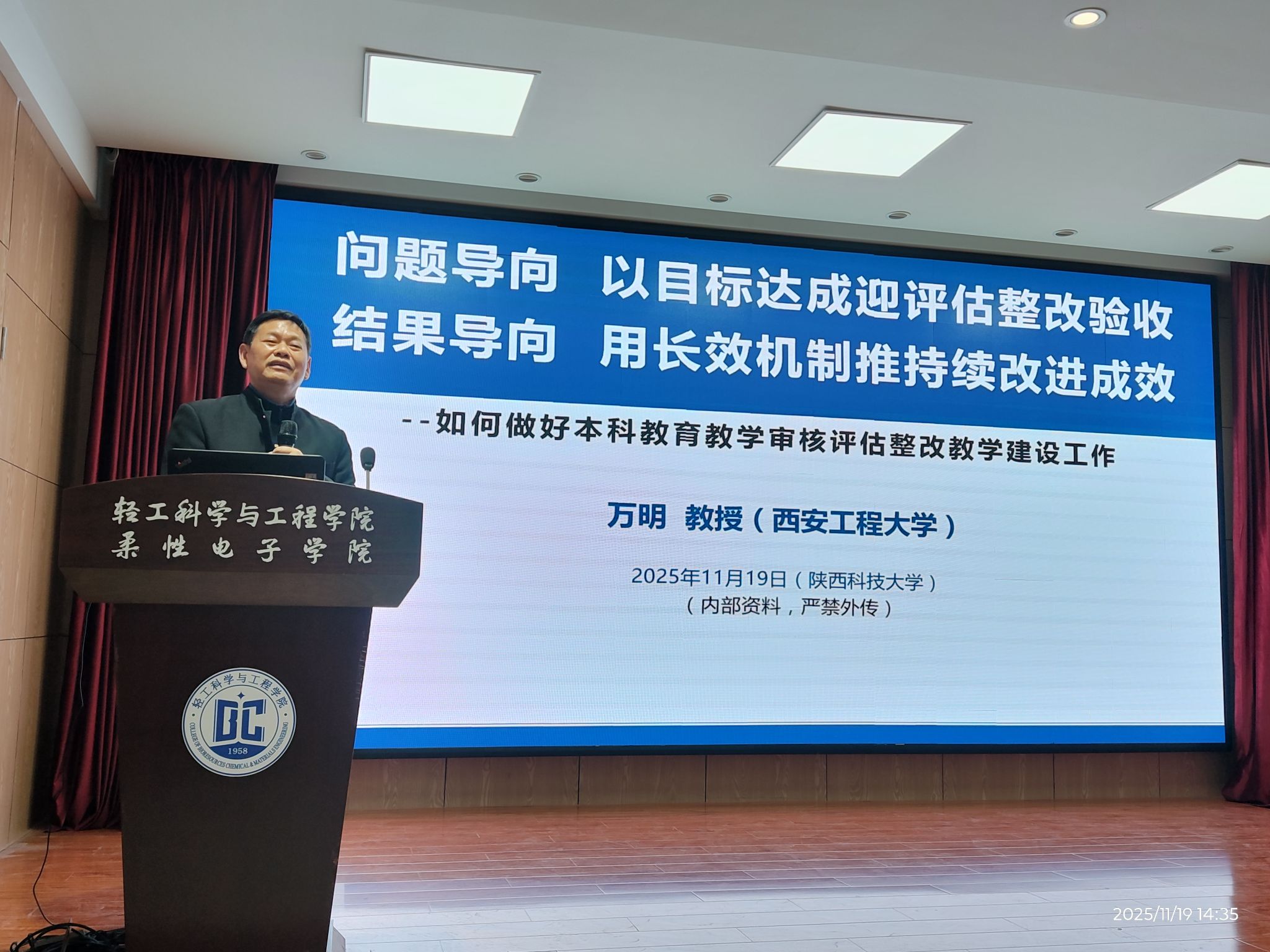 为深入推进本科教育教学审核评估整改工作,全面提升人才培养质量,11月19日下午,教务处、轻工科学与工程学院(柔性电子学院)特邀西安工程大学万明教授做客我校“教育教学论坛”,在实验楼1B112学术报告厅作题为“如何做好本科教育教学评估整改教学建设工作”的专题辅导。会议由轻工学院院长吕斌主持,轻工学院全体教职工及学生代表参加。