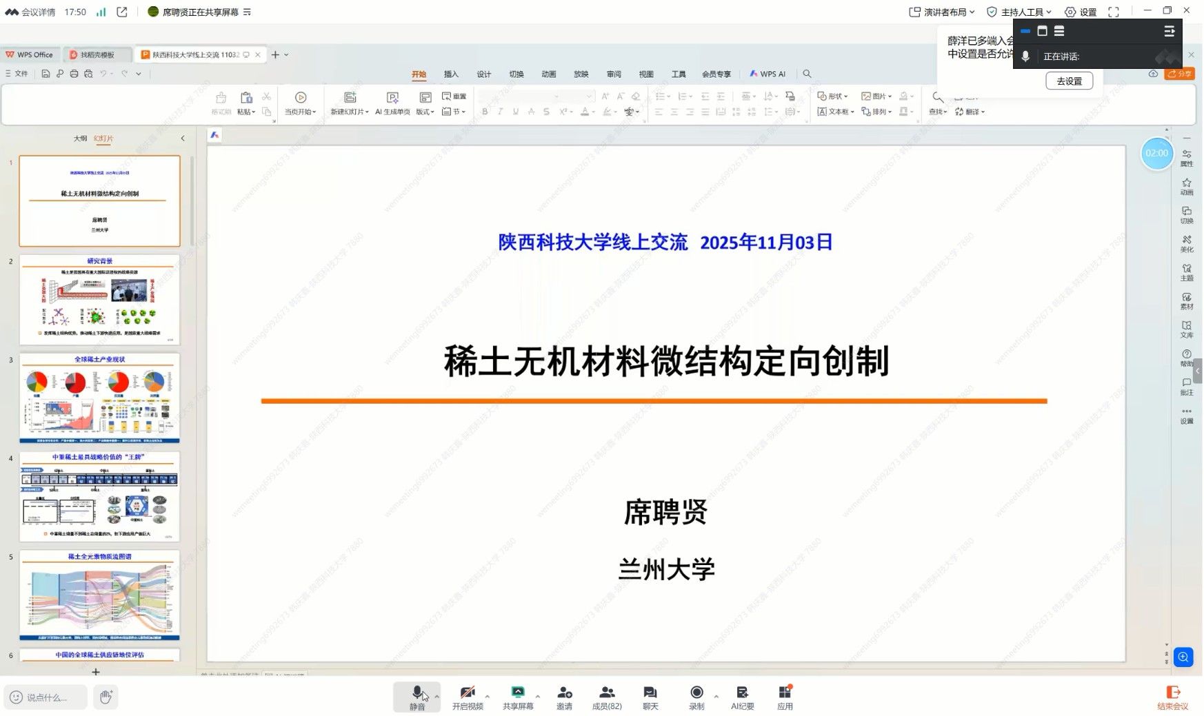 11月3日,应我校科技处、前沿院、轻工科学与工程学院(柔性电子学院)邀请,兰州大学席聘贤教授做客我校“前沿科学报告”,作了题为“稀土无机材料微结构定向创制”的学术报告。报告会由轻工学院副院长刘国栋主持,学院相关研究方向师生共同参与交流。